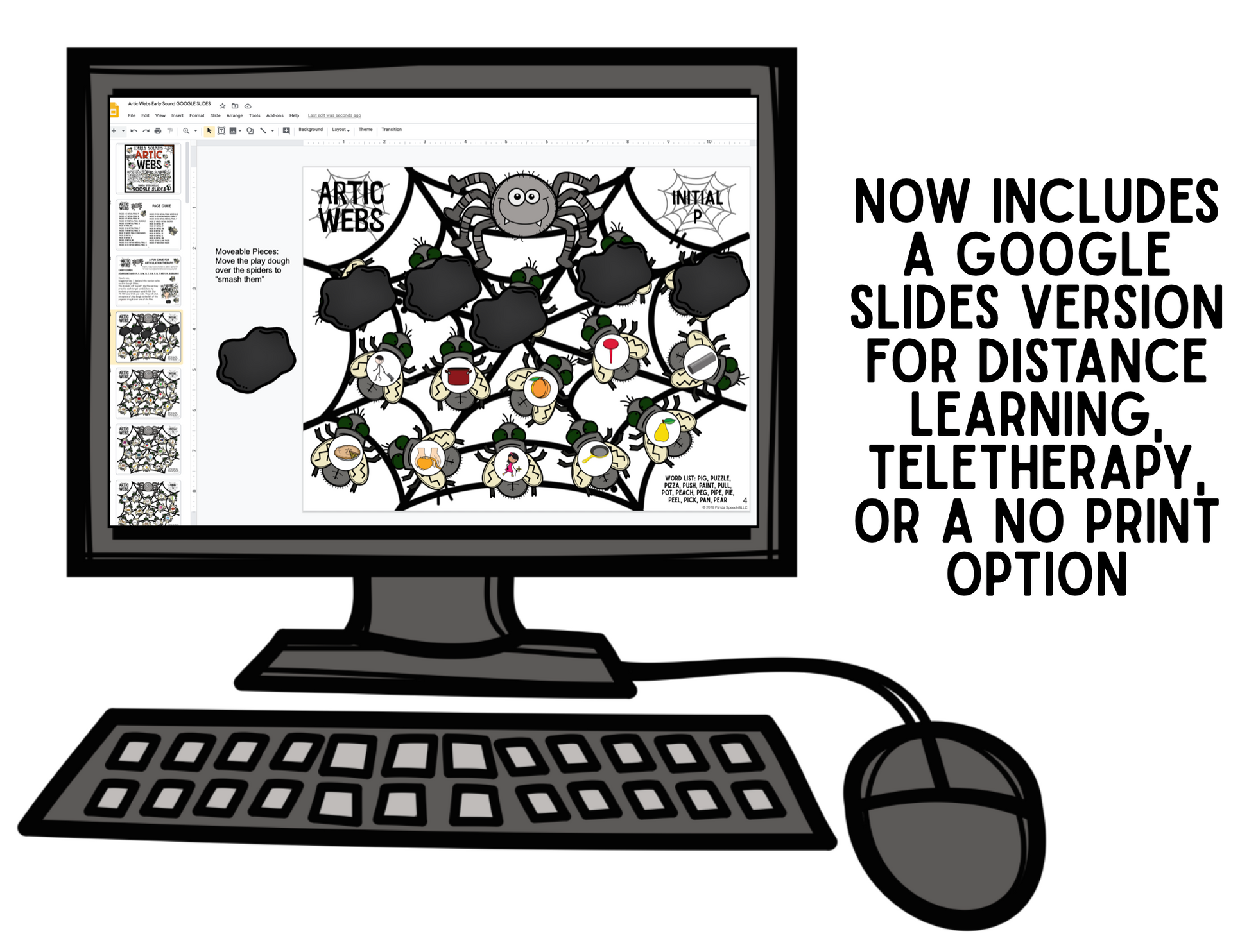 Need a fun play dough companion for eary articulation sounds? Try this, your students will LOVE "squishing" the flies on the spider web! I designed it to be used with out play dough but you can use it however you like! Mr. Spider is hungry! Help him catch the flies while practicing target words! Now includes a Google Slides option with moveable pieces for teletherapy, distance learning, or a no print option!