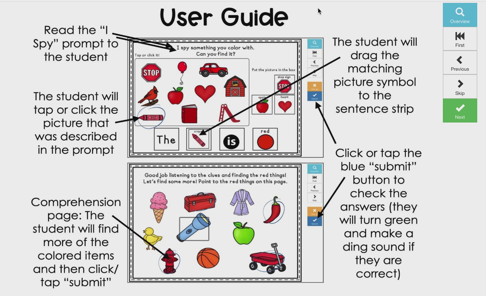 How I use this book: I use this book with students who are still learning to identify colors. It is a way to bombard each color (I have a book for each primary color). I also use it as a language activity (identifying the object after hearing a description). Read the “I Spy” prompt at the top of the book. The student will identify the object on the page that matches the description and find the matching picture symbol and put it in the sentence strip and verbalize it “The apple is red.” You can also have them circle the object with a dry erase marker on the print version! The last page of the book is a comprehension check, it has objects of multiple colors and the students have to point to and identify the red things.