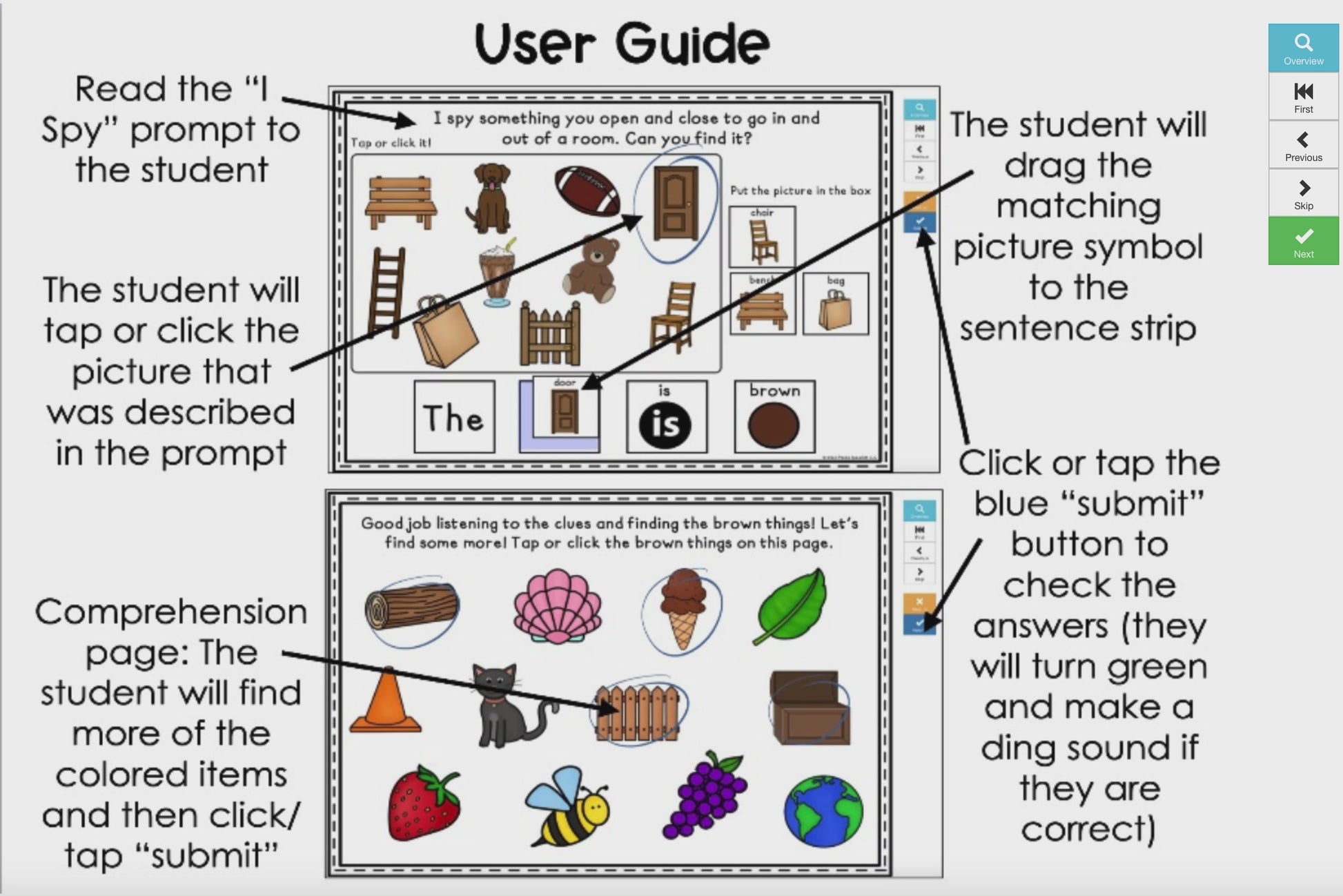How I use this book: I use this book with students who are still learning to identify colors. It is a way to bombard each color (I have a book for each primary color). I also use it as a language activity (identifying the object after hearing a description). Read the “I Spy” prompt at the top of the book. The student will identify the object on the page that matches the description and find the matching picture symbol and put it in the sentence strip and verbalize it “The door is brown.” You can also have them circle the object with a dry erase marker on the print version! The last page of the book is a comprehension check, it has objects of multiple colors and the students have to point to and identify the brown things.