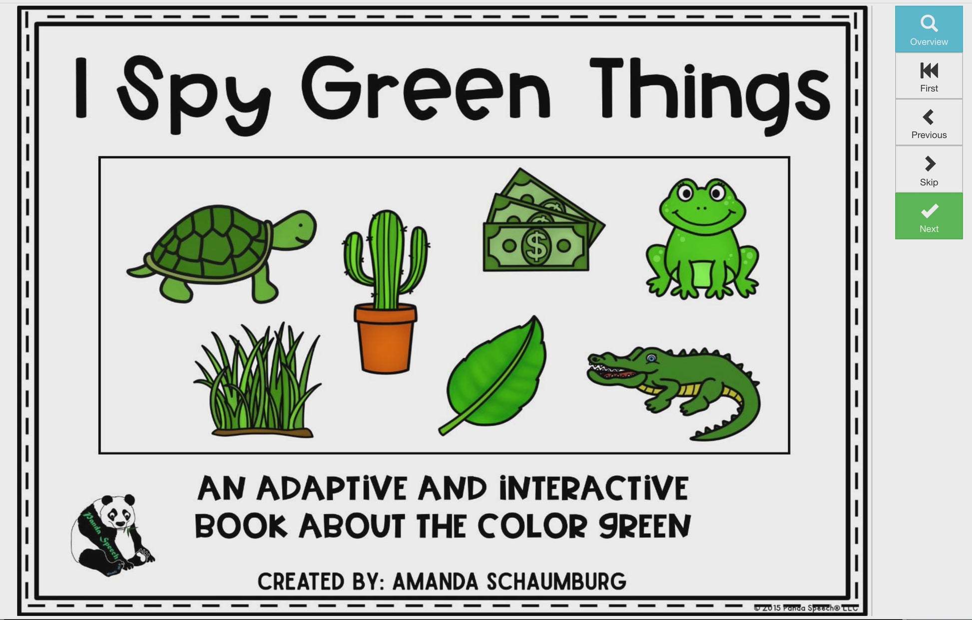 How I use this book: I use this book with students who are still learning to identify colors. It is a way to bombard each color (I have a book for each primary color). I also use it as a language activity (identifying the object after hearing a description). Read the “I Spy” prompt at the top of the book. The student will identify the object on the page that matches the description and find the matching picture symbol and put it in the sentence strip and verbalize it “The frog is green.” You can also have them circle the animal with a dry erase marker on the print version! The last page of the book is a comprehension check, it has objects of multiple colors and the students have to point to and identify the green things..