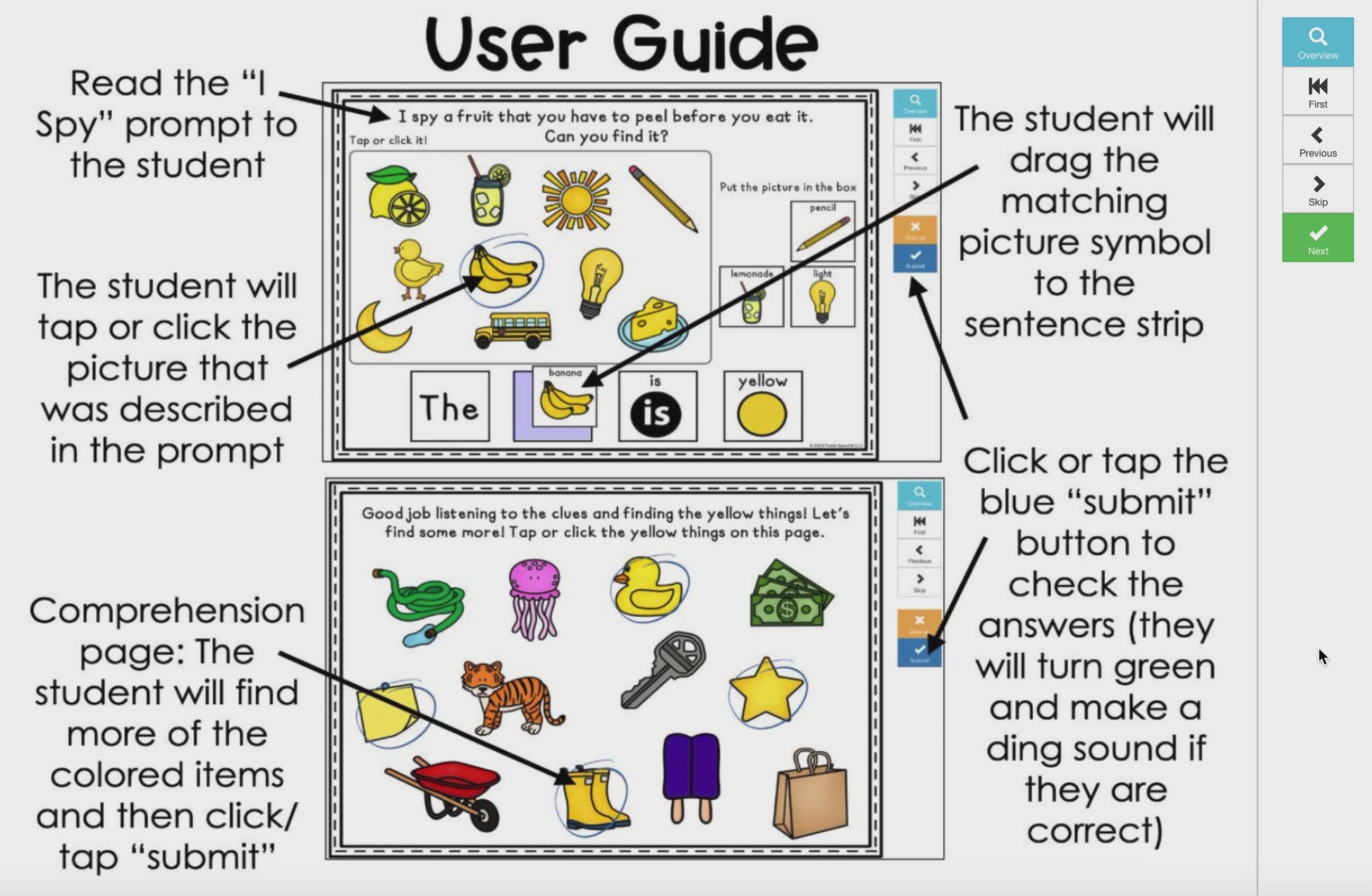 How I use this book: I use this book with students who are still learning to identify colors. It is a way to bombard each color (I have a book for each primary color). I also use it as a language activity (identifying the object after hearing a description). Read the “I Spy” prompt at the top of the book. The student will identify the object on the page that matches the description and find the matching picture symbol and put it in the sentence strip and verbalize it “The bus is yellow.” You can also have them circle the object with a dry erase marker on the print version! The last page of the book is a comprehension check, it has objects of multiple colors and the students have to point to and identify the yellow things