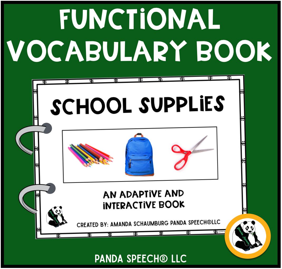 How I use this book: I read the function prompt at the top fo the page. I point to the large picture on the page and see if they can identify it (I use the prompts: “what do you see” “what is this” or “this is a ____”). I lay out a choice of 3 images (you can use more or less depending on ability) and have them find the matching picture and place it in the blank square on the page. After that I have them repeat the sentences on the page while pointing to the symbols. “I use a ____ at school ” If the student is limited-verbal, I have them point to the symbols while I verbalize the sentence for a model or have then tell you with their AAC device (again, providing a model when needed).