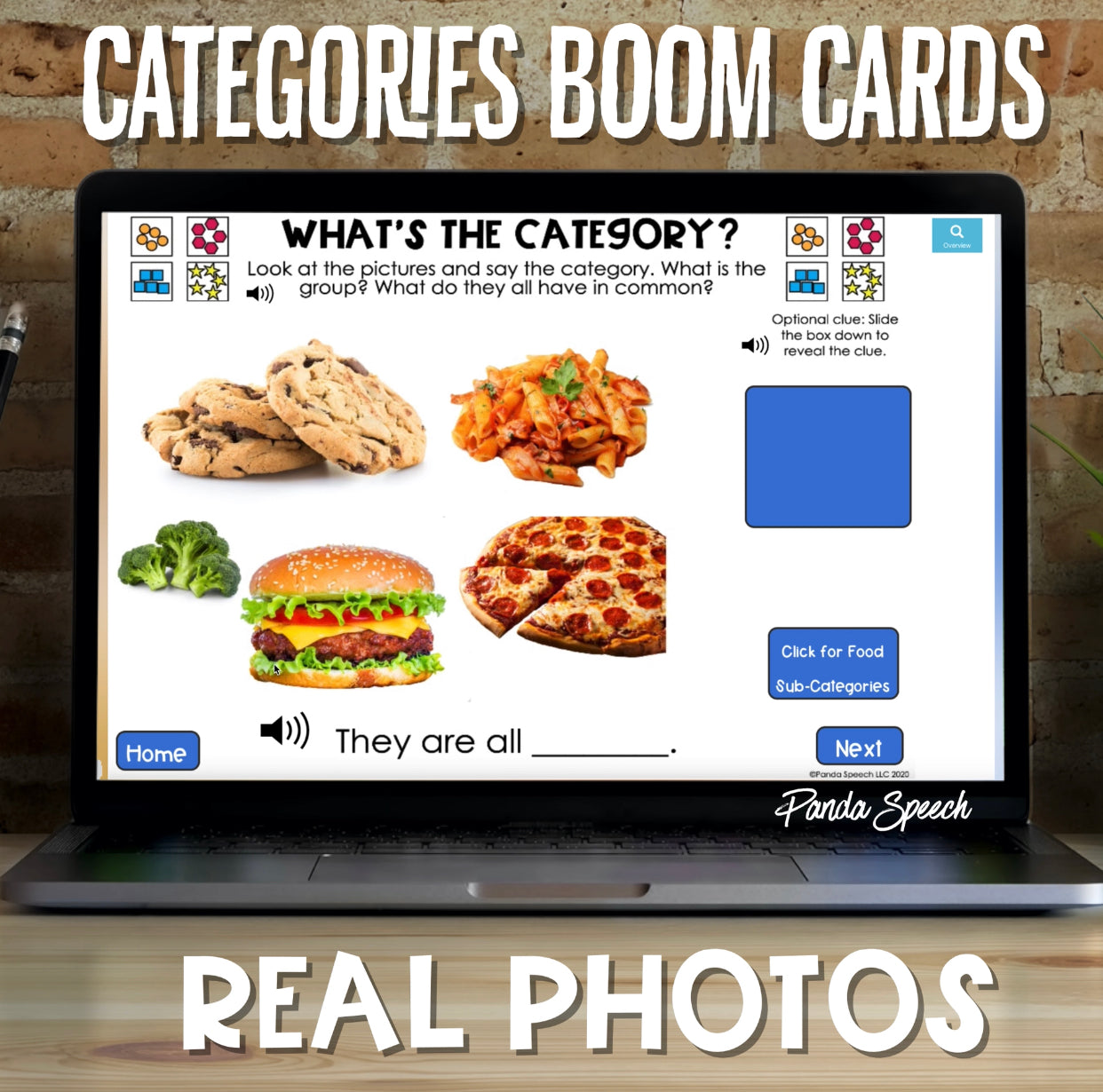 - 37 Name the Category Cards: These cards have an image of multiple items and the students are prompted to name the category. There is a carrier phrase at the bottom that you can use to help elicit the category (“They are all _____”). I also included a hidden clue in the digital version to use if the child is having difficulty naming the category (optional). The student will slide the box down to reveal the clue. If you are using the printed card, you can provide a verbal cue as needed. I have included 20 main categories and subcategories for food, animals, and clothing. The purpose of these cards is for the student to respond orally (there is no self checking element or multiple choice option in the digital version).