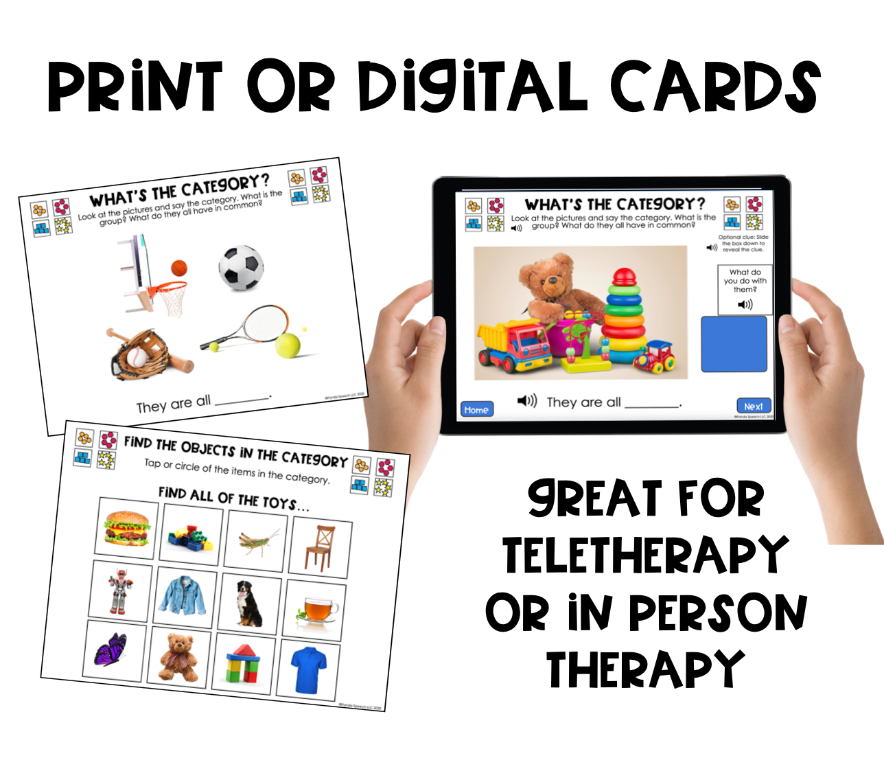 - 25 Name 3 items in a Category: These cards have three checkmarks for the students tap as they name three items in the category prompted. There is a hidden clue to help the student if they need help getting started (there is picture of one of the items to help them get started naming in the digital version). The student will slide the box down to reveal the clue. The purpose of this card is for the student to respond orally, there is an interactive element of tapping the checkmarks as you name the items in the digital version. If you are using the printed version, they can tap the boxes or use a dry erase marker to check the boxes as they go.
