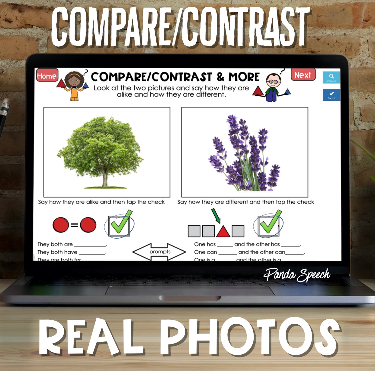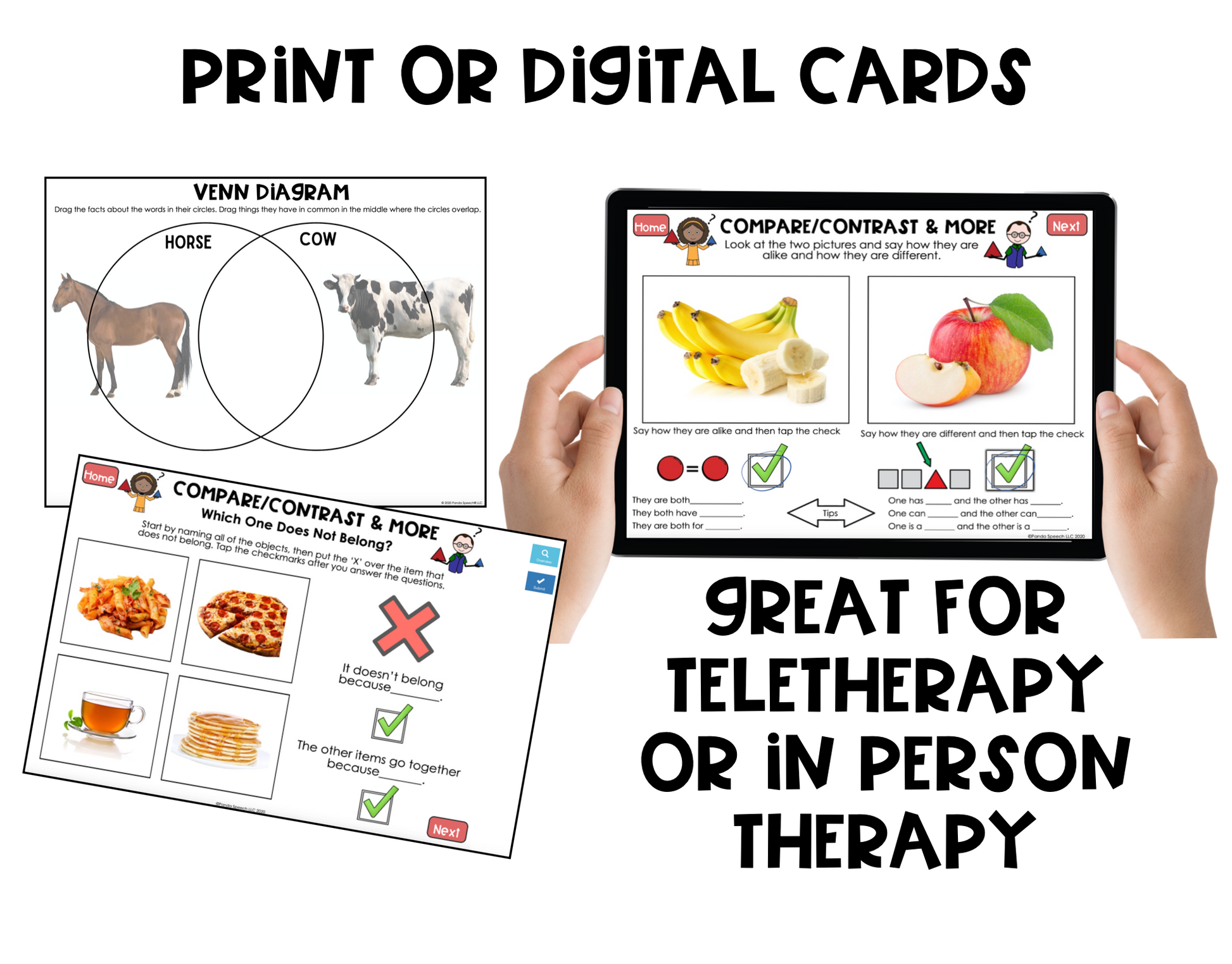 - 50 Compare/Contrast Cards. These cards have two pictures and the student is prompted to say how they are alike and different. Print version: the student can check the box with a dry erase marker. Boom version: The student will tap the checkmarks to circle them when they are finished. These cards are not self checking, they are designed to use with a therapist, teacher, or parent providing feedback.