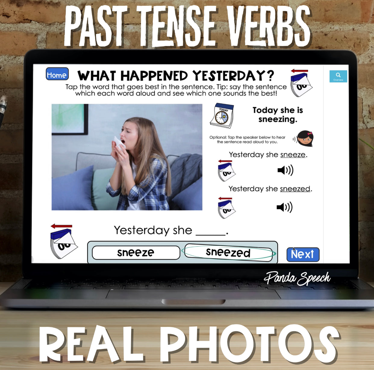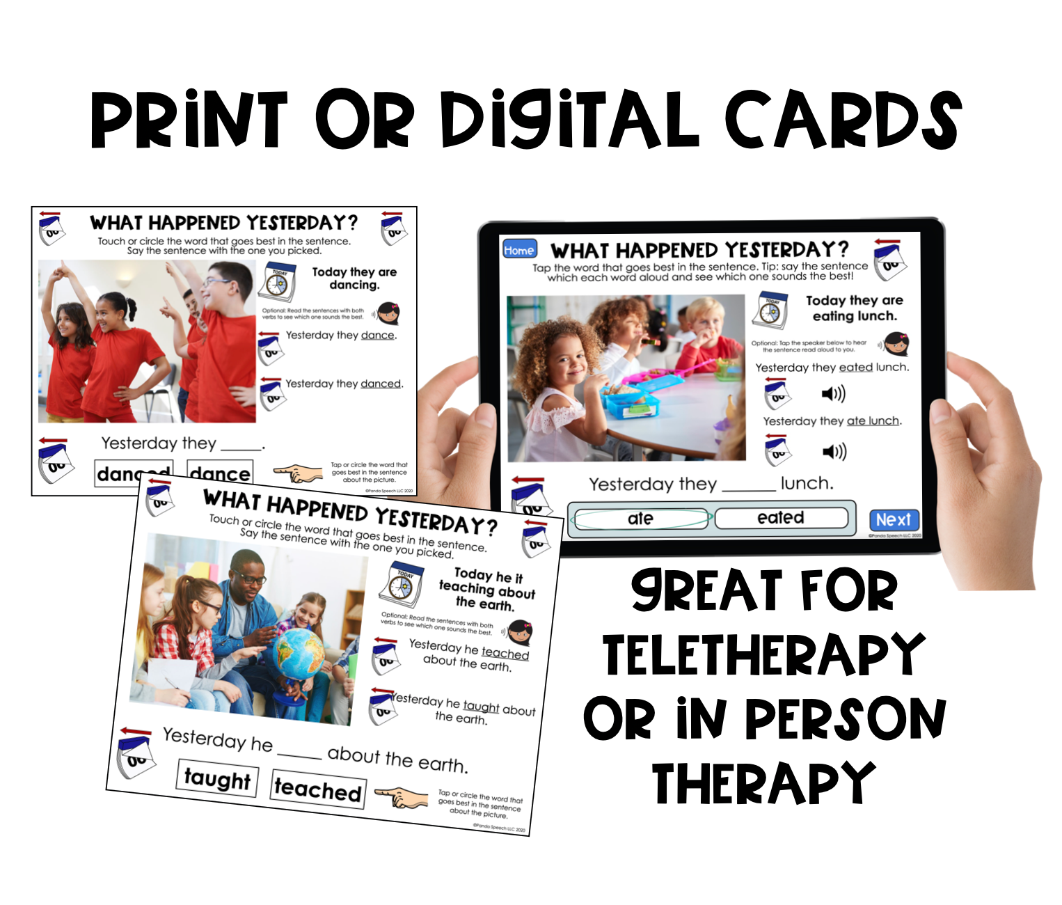 I typically review the regular and irregular cards first and then do the mixed set to see if they are grasping the concepts and can discriminate the regular vs. irregular verbs. When I work on these skills, I often just ask for the response orally, but I included the text choices if you need them or to provide feedback for the student. . I present the cards by saying “Look at this picture” and then I say what they are doing today “Today they are eating lunch” Then I say “Now it is the next day, let’s say what they did yesterday. I then ask the student to say what they did yesterday “Yesterday they ate lunch” or if the students need more support I say the cloze phrase and have them fill in the verb “Yesterday they _____ lunch.”