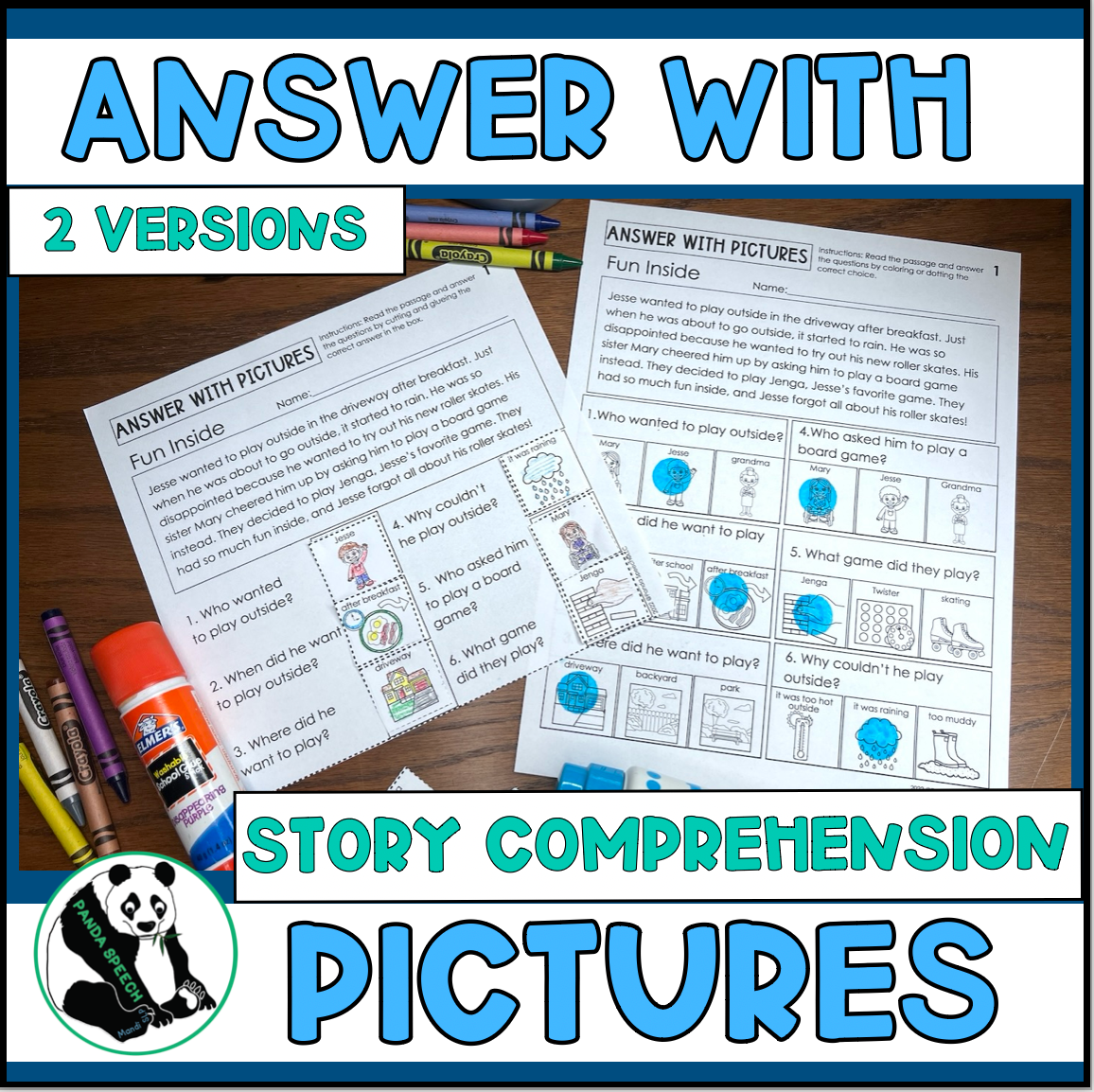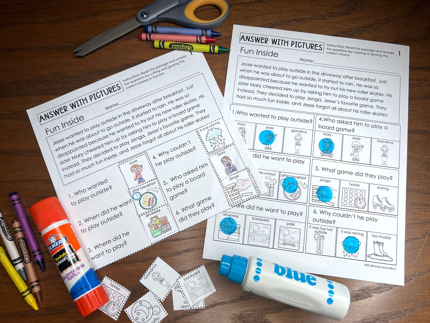 • Cut and paste activity: This adds a craft and fine motor element to make it more engaging. I included 12 answer choices for the 6 questions. The teacher or therapist can choose to use all of them or remove the some of the incorrect answers, depending on their students’ needs (customizing the field of answers for each child). Your students can color or dot the correct answers before cutting them out (optional ).