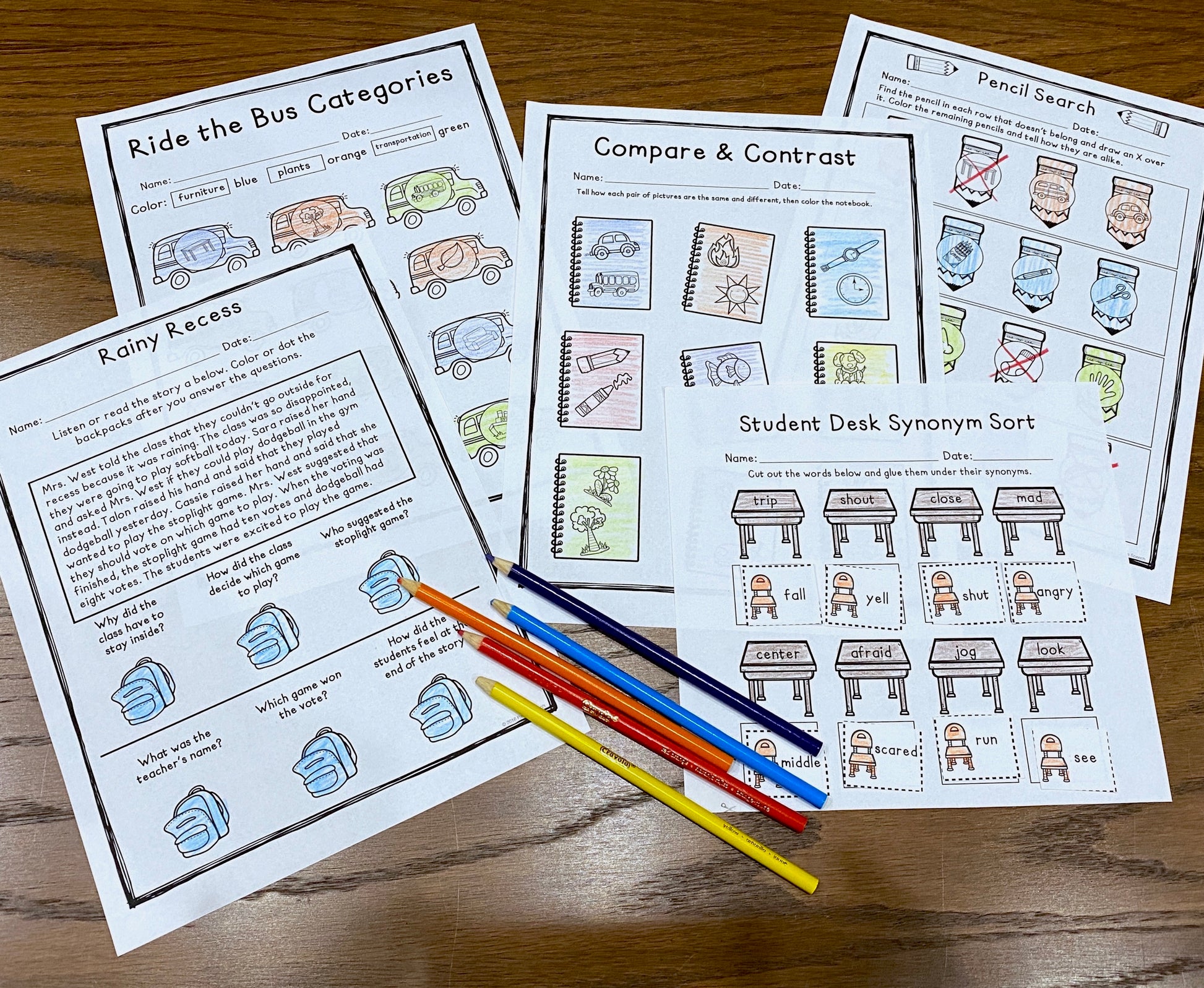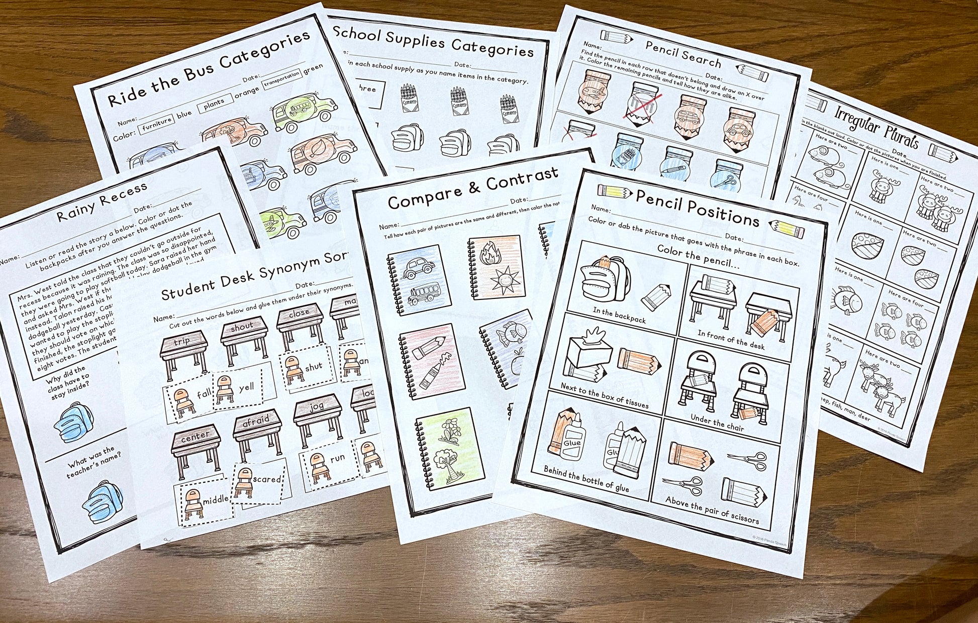 • Table of Contents/Printing Guide • Ride the Bus Categories (finding items in a category) • School Supplies Categories (naming items in a category) • Pencil Search (Which One Doesn't Belong) • School Stories (listening comprehension, wh-questions) • Paper & Pencil Associations • School Vocabulary Bingo (BONUS full color version included) • Compare/Contrast • Past tense (regular/irregular) • Plurals (regular/irregular) • Sharpened Questions (separate pages for who, what, when, where, and why questions) • Social Skills Notes (good friend vs. not a good friend behavior) • School Feelings • Sentence Backpacks (subject-verb agreement) • Student Desk Synonym Search • Antonyms Homework • Color by Multiple Meanings • Apple Adjectives • School Word Work • Backpack/Apple Story Retell or Recap • Rhyming Desktops • Pencil Positions (positional vocabulary) • Sentence Notebooks (sentence absurdities) • School Listen Up (1&2 step directions) • Color A Backpack Open Ended Game • BONUS Drill sheet (color and b&w)