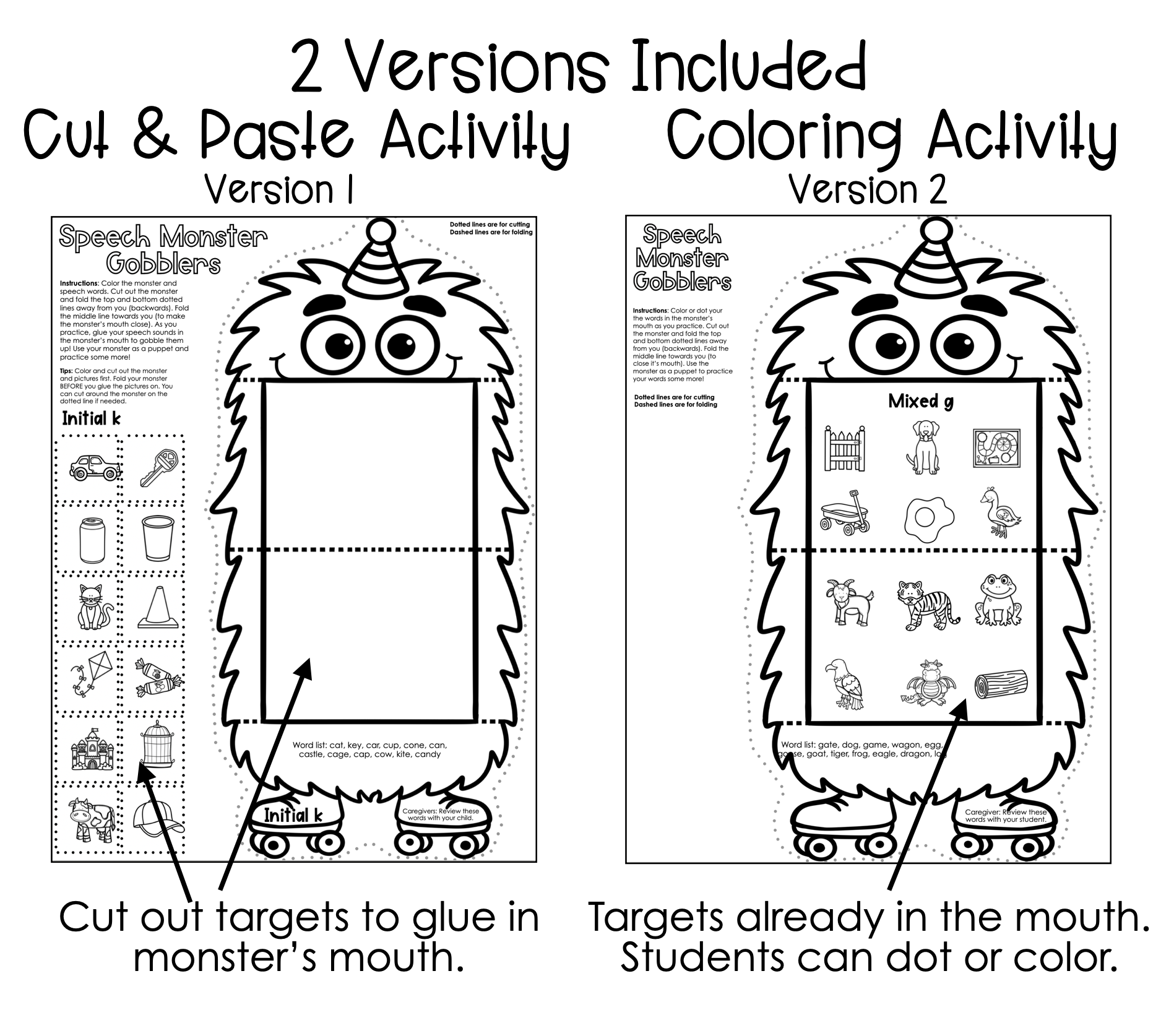 The two versions includes a cut & paste activity (glue targets  in the monster’s mouth) and coloring (color targets already in monster's mouth). I created two versions for my students with different needs/interests. You decide what is best for your students.