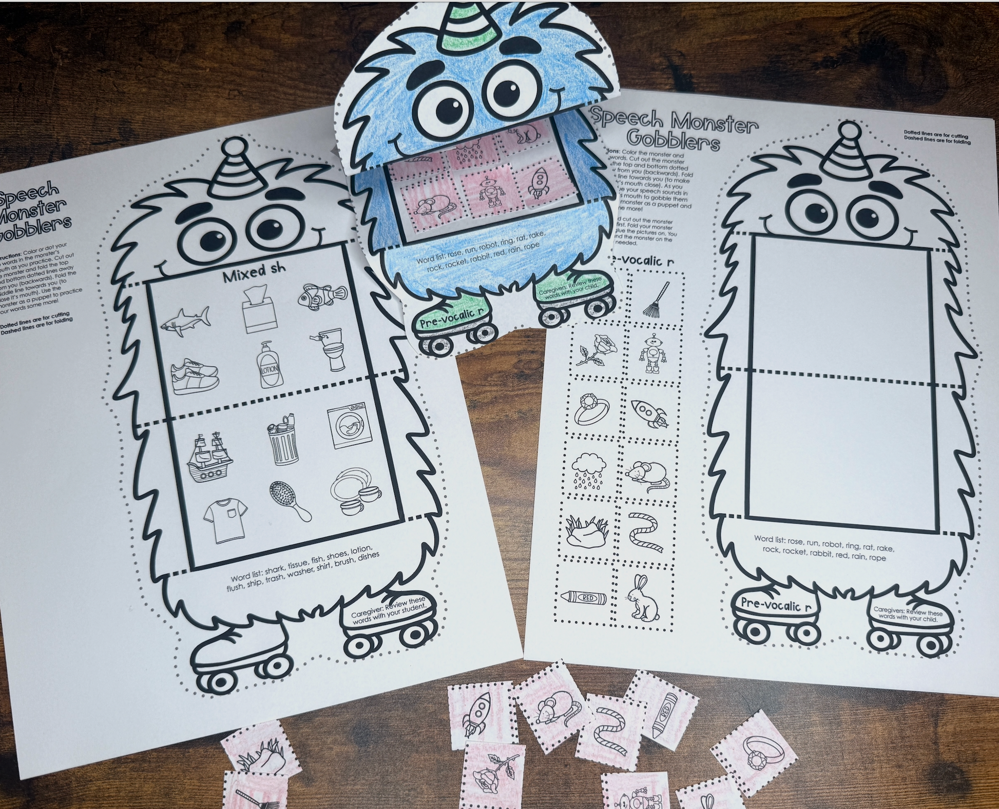 This activity was designed to be a simple, no-prep activity to target articulation and language while making a fun Monster mouth craft.  It is also a GREAT way to encourage home practice because when completing crafts it creates the “look what I made” mentality which increases the likelihood that the student will show their caregiver and review. A quick caregiver note is included on the side of the page. These can also be used as puppets for students to practice their speech and language targets with.