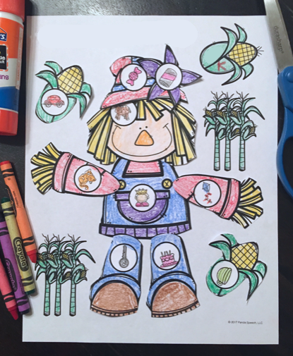 → To use: Print out a cornfield page for every student in the group (page 5 or 6 of the download). Page 6 has a guide for students who need it. Print out the scarecrow page with the target sound needed for each student. I have the students color the cornfield first so that they are ready to build their scarecrow (or you can have them color it in between turns to keep their hands busy). The student will color and practice each target word on the parts of the scarecrow. The student will cut out the parts and practice the words again. The student will glue each part on the cornfield and practice the word one more time!