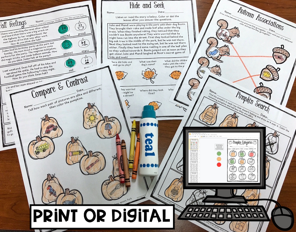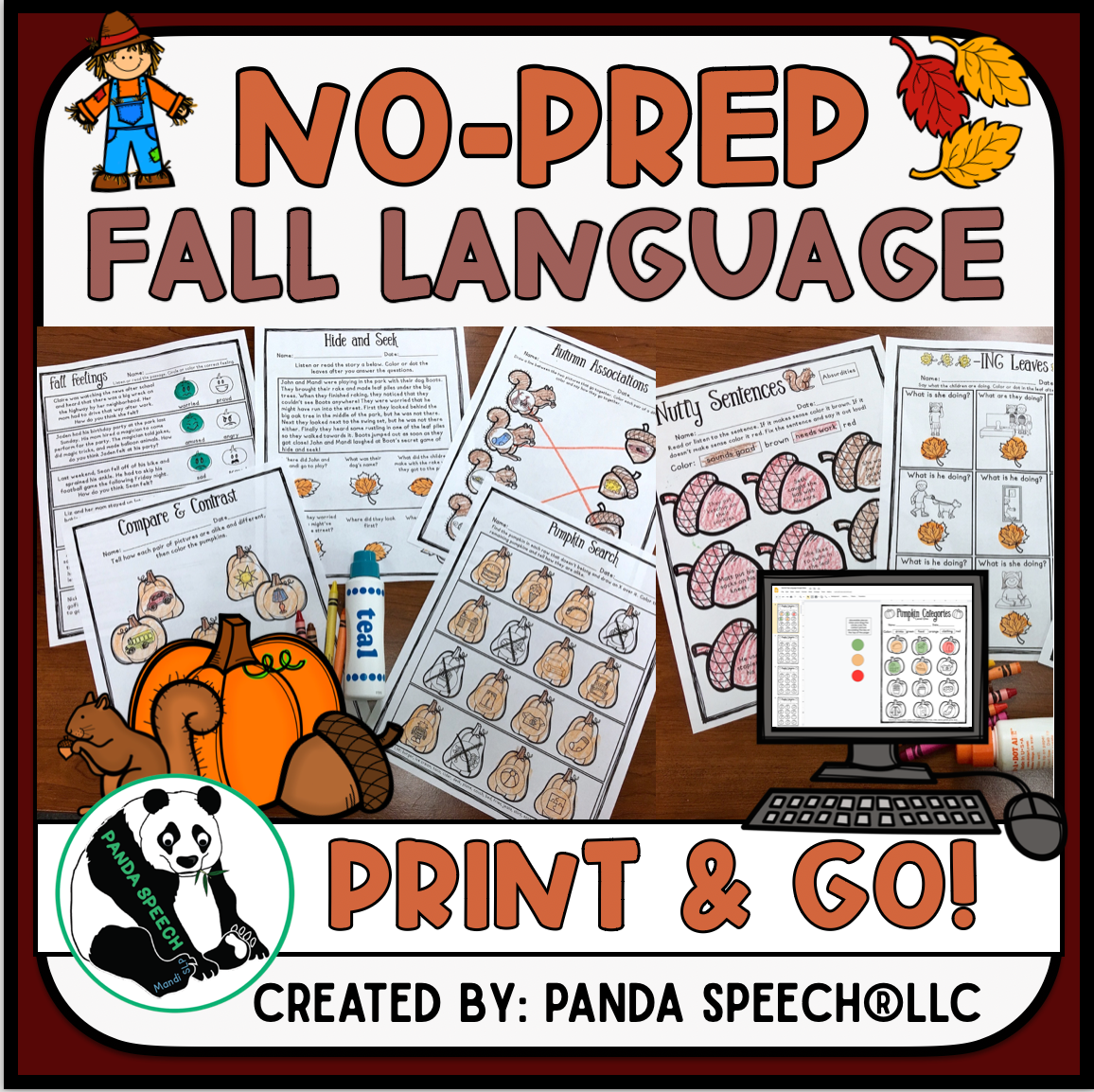 • Pumpkin Categories (finding items in a category) • Autumn Categories(naming items in a category) • Pumpkin SearchWhich One Doesn't Belong • Fall Stories (listening comprehension, wh-questions) • Compare/Contrast • Autumn Associations (go-togethers) • Fall Day Vocabulary • Ing Verbs • Regular/Irregular Verbs • Regular/Regular Plurals • Fall Feelings • Social Skills Pumpkins(good friend vs. not a good friend behavior) • Pumpkin Pie Antonyms Sort • Color by Synonyms • Warm Cider Sentences (subject-verb agreement) • Nutty Sentences (sentence absurdities) • Pumpkin Adjectives • Fall listen Up (1&2 step directions, and open-ended) • Color by Multiple Meaning Words • Pumpkin Word Work • Pumpkin Story Retell • Rhyming Pumpkins • Autumn Bingo (fall vocabulary) • BONUS Color-A-Scarecrow open ended activity • BONUS Full Color Autumn Bingo • 54 Google Slide pages with moveable pieces (please note: pages that require coloring were not converted to Google slides).
