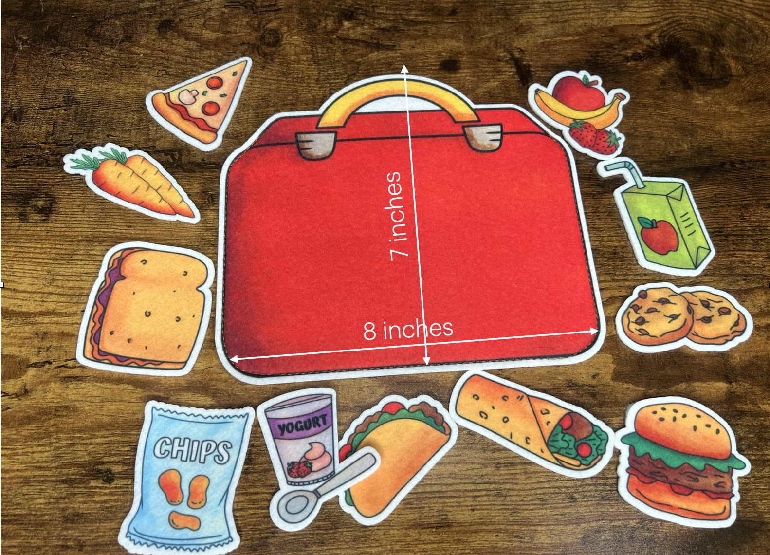 The food items vary in size ranging from 1.5" to 3.5" inches (example: Sandwich is 2.5"X2.5" and the carrots are 3.5"X 1.5")