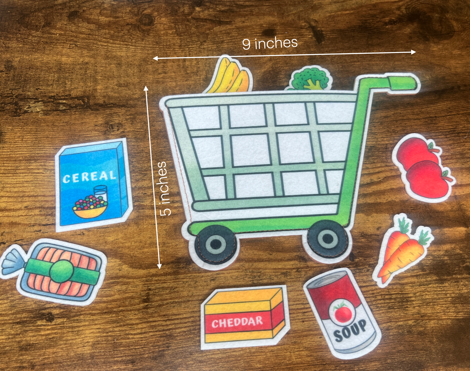 Material: Felt Polyester Fiber/polyester. The food items are printed on one side of the felt, the back is white. The cart is printed on one side, the back is brown.