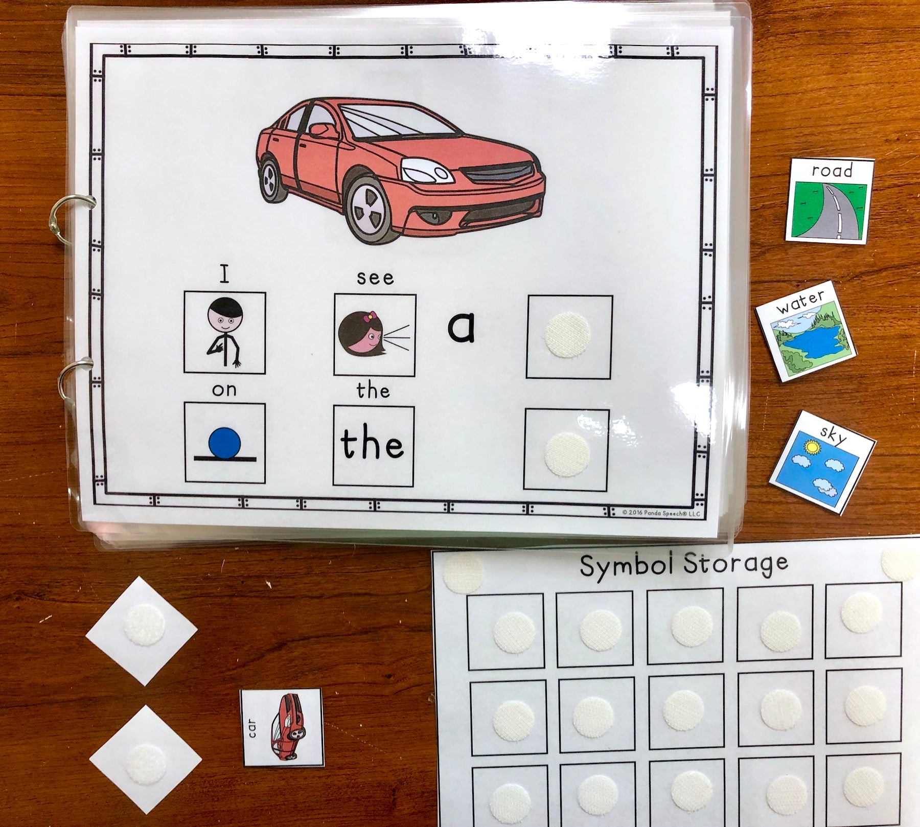 How I use this book: I point to the large picture on the page and see if they can identify it (I use the prompts: “what is this” or “this is a ____”). I lay out a choice of 3 images (you can use more or less depending on ability) and have them find the matching picture and place it in the blank square on the page. Next I ask them “where does a truck go?” “on the road, water, or sky?” (while holding up or pointing to the symbols). The student will then place the correct symbol in the blank square. After that I have them repeat the sentences on the page while pointing to the symbols. “I see a truck on the road” If the student is limited-verbal, I have them point to the symbols while I verbalize the sentence for a model or have then tell you with their AAC device (again, providing a model when needed). For some of my students I will break it up into two phrases “I see a truck” “on the road.”