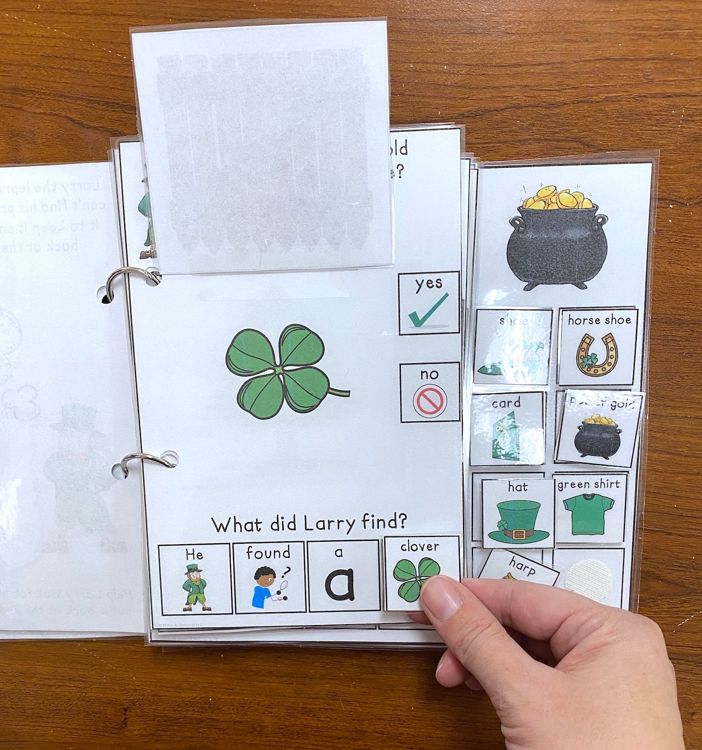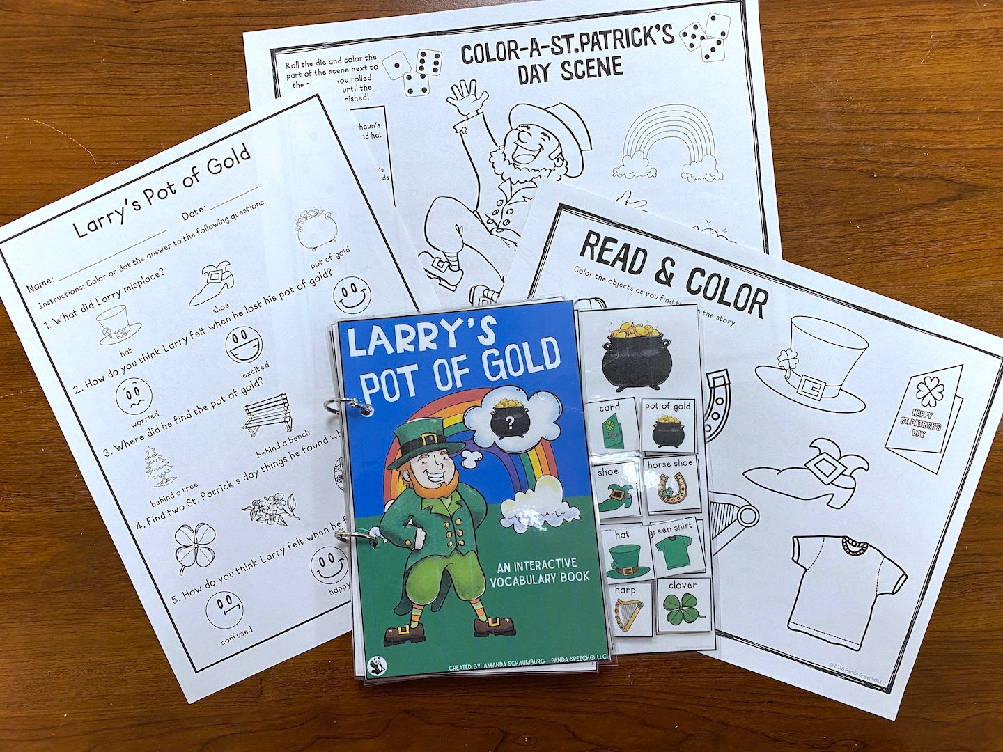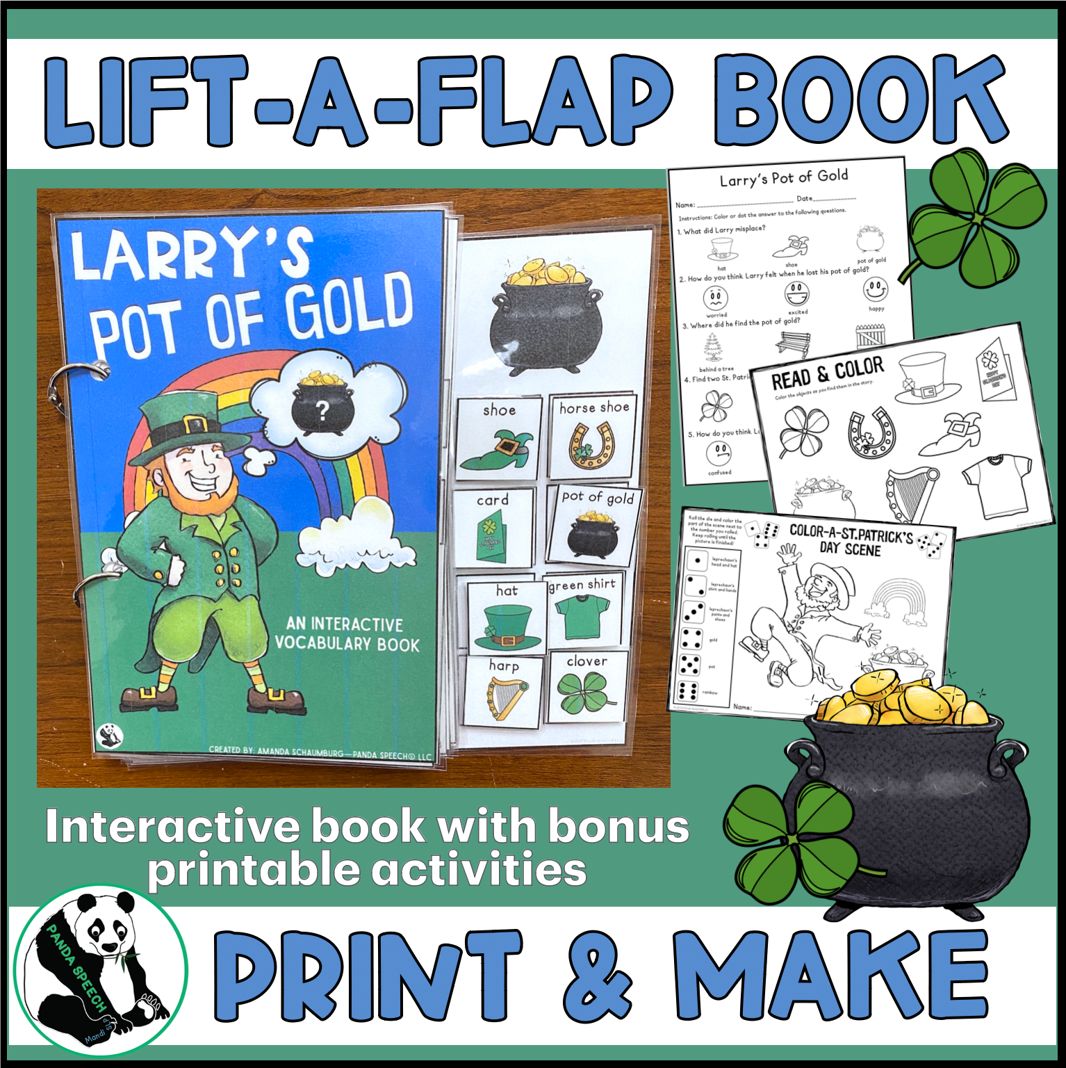 Your students will love lifting the flaps to help Larry the Leprechaun find his missing pot of gold! This book targets themed vocabulary, MLU, yes/no questions, and more! It has two interactive elements to keep your students engaged! (lift-able flaps & picture symbols)