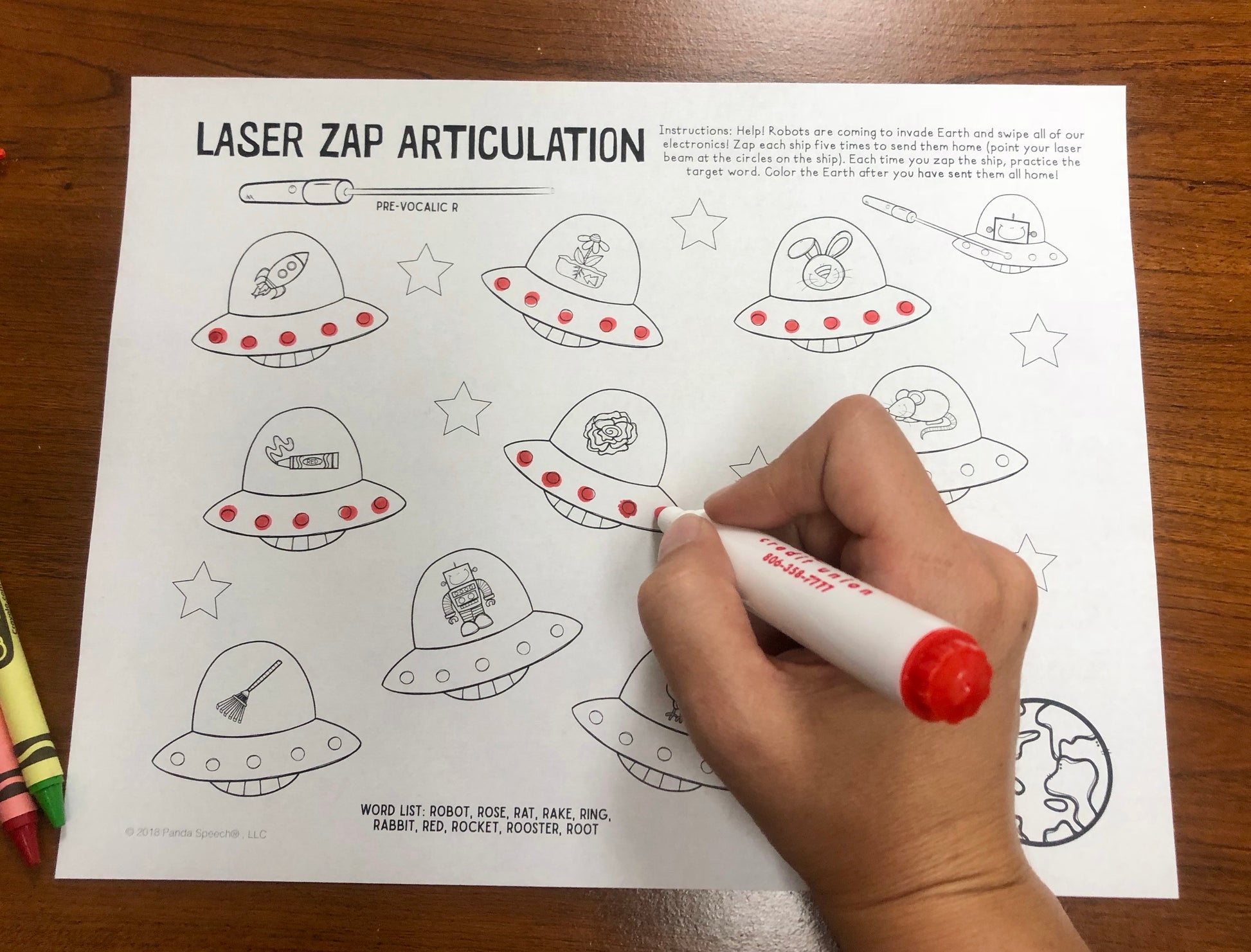 To use: The student will practice the target skill on the space ships and use a laser pointer to “zap” the ship (point it on dots on the ships). Optional: The students will color the ships they have zapped to keep track (this keeps hands busy in between turns). The therapist will determine the number of trials per zap!