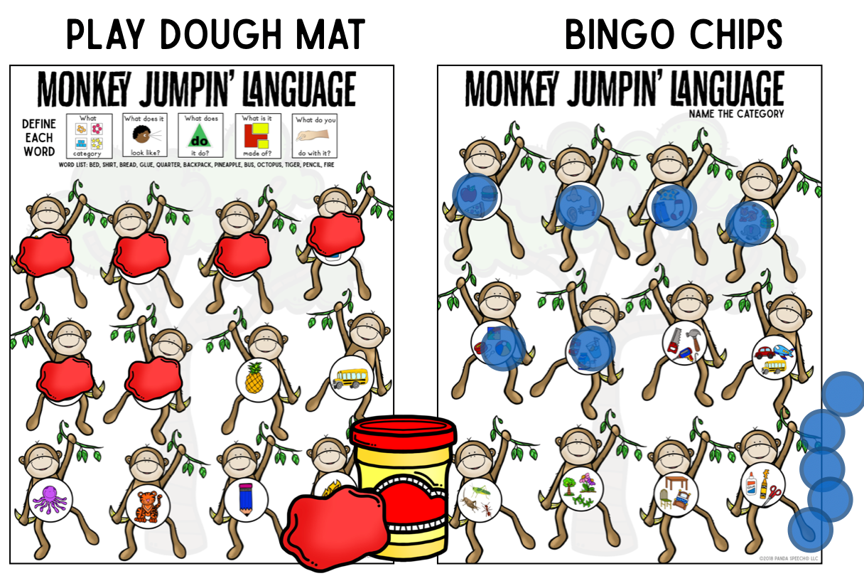 Play dough mats: The student will squish play dough over each monkey after they practice the target skill.