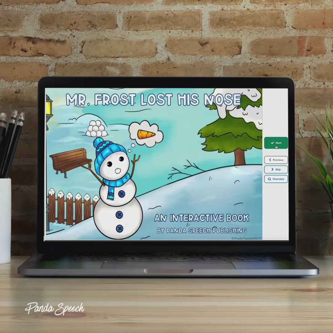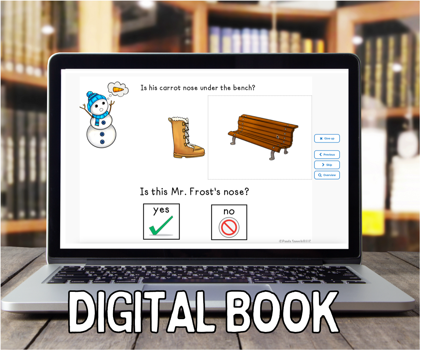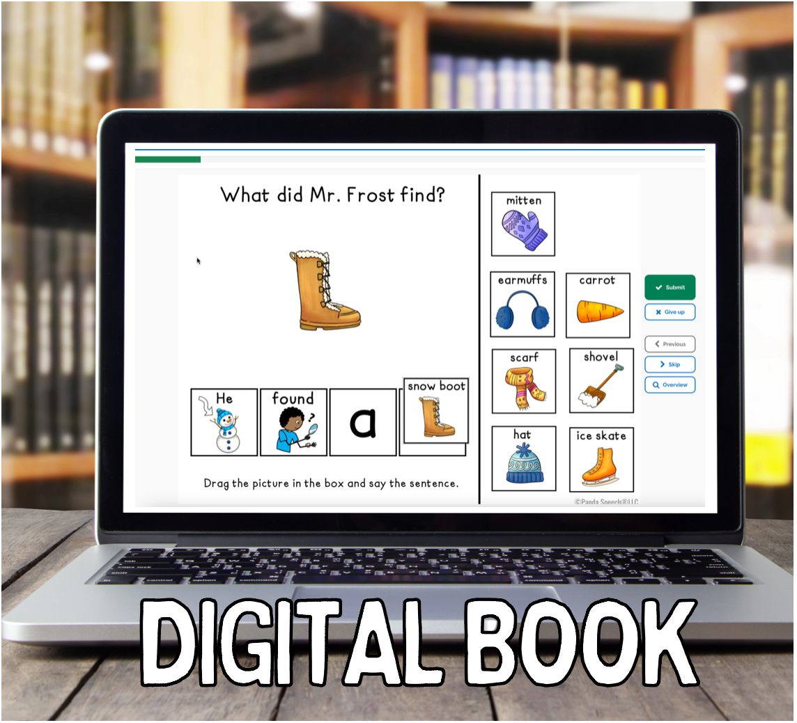 Read the book to the student. At the top of each page, the student is asked to look to see if Mr. Frost’s nose is under or behind the objects around the park (they will slide the object over to reveal what is behind it). They will then answer yes/no by selecting yes or no (the buttons are self-checking). Encourage them to verbalize if they are able. The student then will match the picture symbol to the box in the sentence strip (by dragging the correct symbol) and if they are able, verbalize the phrase (“He found a _____”). This is self-checking too. At the end of the book, the student put the carrot nose back on Mr. Frost’s face and build a snowman. After that, there are comprehension questions that are tap-able and self checking.