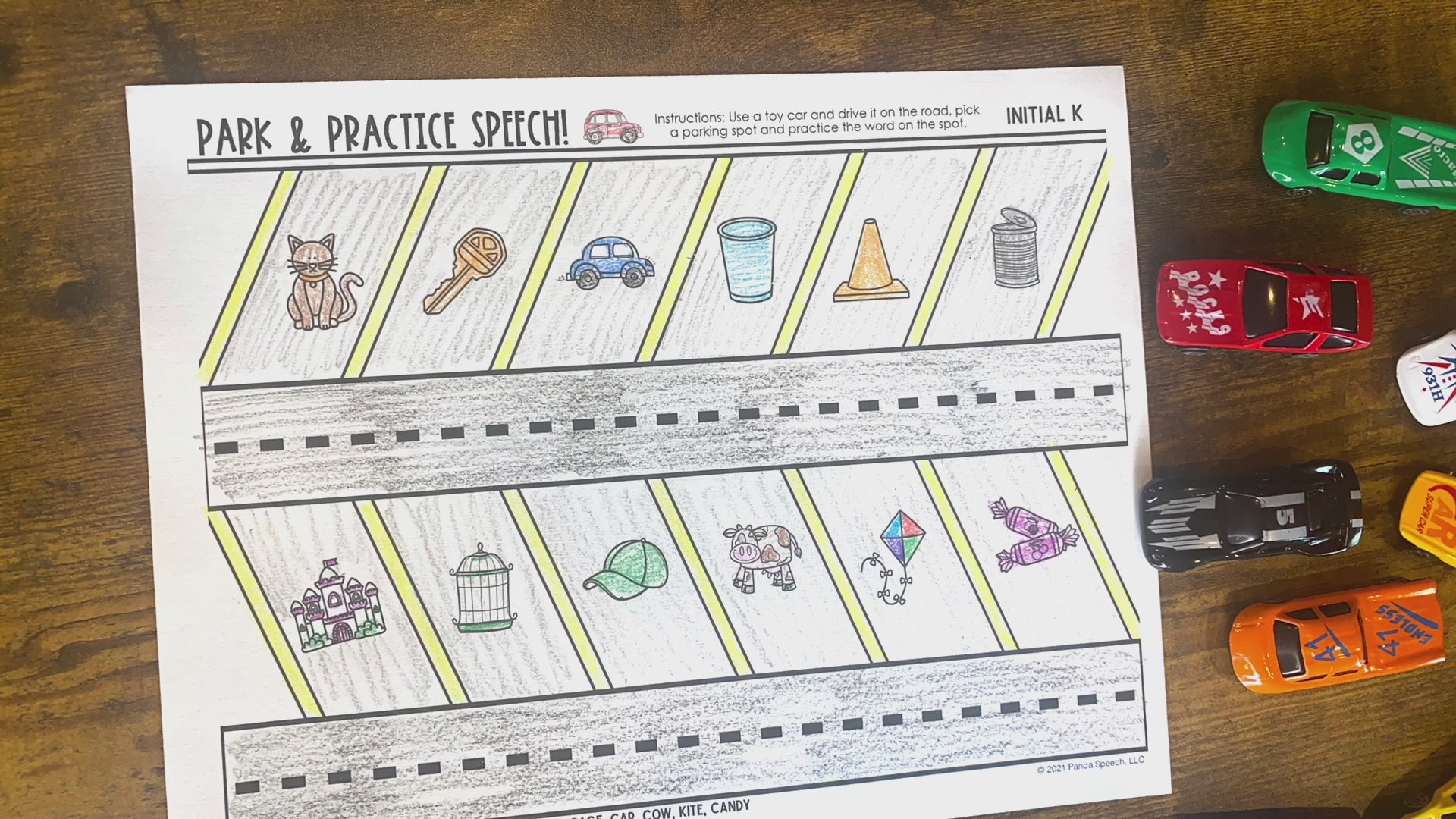 • Multiple cars: Tell the student to drive each car to a spot and practice the word underneath it.  (you will need 12 cars to fill it ups). The therapist will determine the number of trials per word