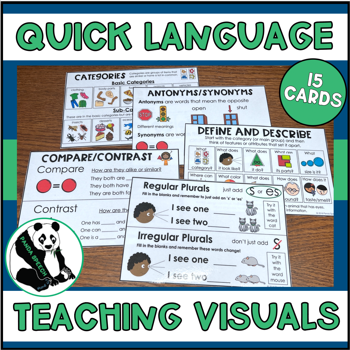 - (10) 1/2 page mini visuals for categories, compare/contrast, antonym/synonyms, past tense verbs, plurals, define/describe, story retell/elements, why questions, and multiple meaning words.