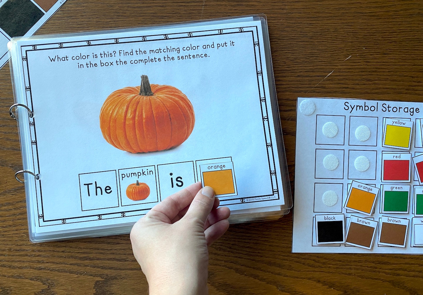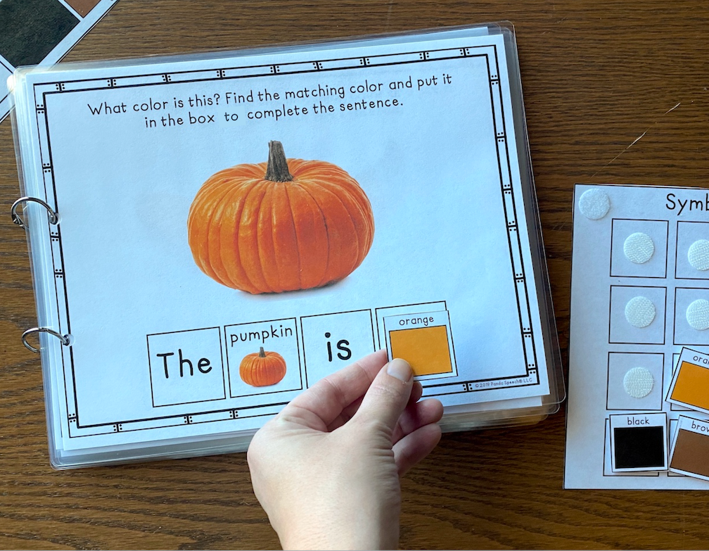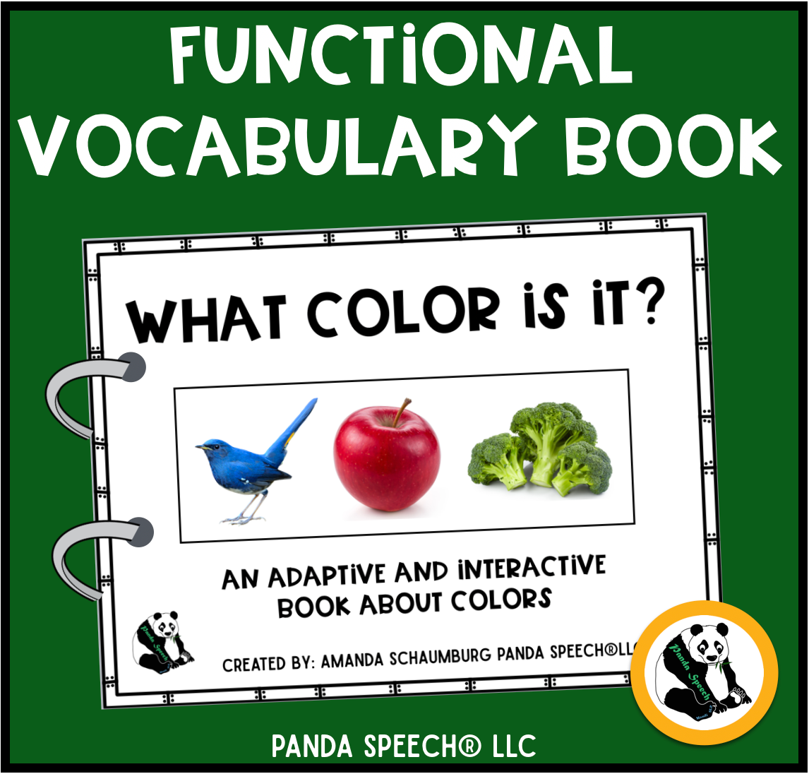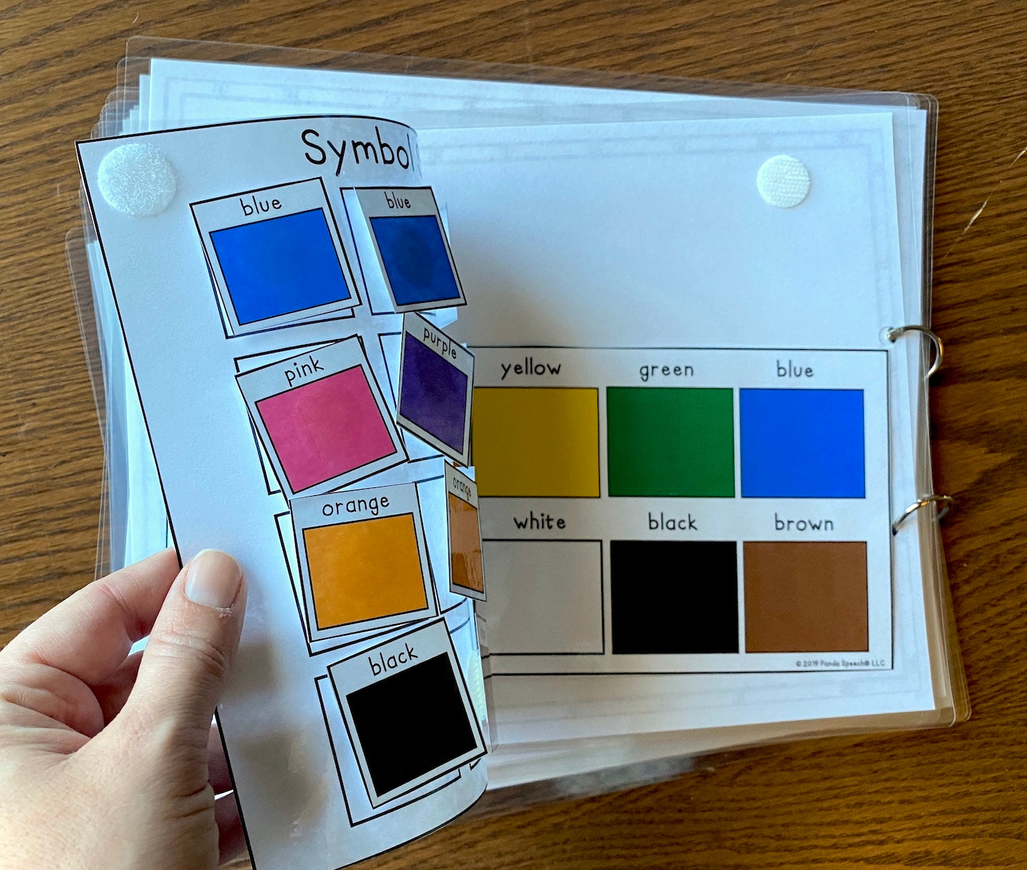 How I use this book: I point to the large picture on the page and see if they can identify it (I use the prompts: “what is this” or “this is a ____”). I lay out a choice of 3 color words (you can use more or less depending on ability) and have them find the matching color and place it in the blank square on the page. After that I have them repeat the sentences on the page while pointing to the symbols. “The ____(object) is ____(color word) ” If the student is limited-verbal, I have them point to the symbols while I verbalize the sentence for a model or have then tell you with their AAC device (again, providing a model when needed).