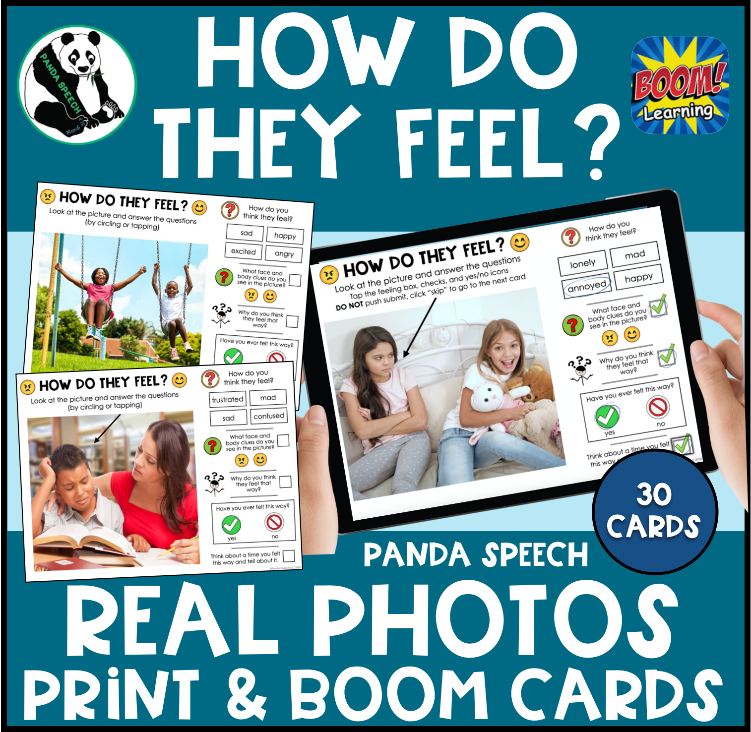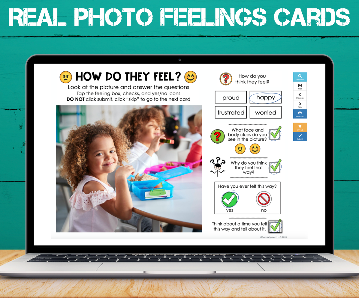 These cards were created to be used for interpreting feelings in a picture. This pack contains 30 full color photos of real people doing relatable things with prompts on the side. I created these cards because I wanted to have more in-depth and meaningful discussions about feelings with my students. These cards have built in prompts to help guide your student to make a personal connection and use inferencing skills. The therapist/teacher can use the cards at their own discretion but here are the skills I target using them in speech therapy sessions: