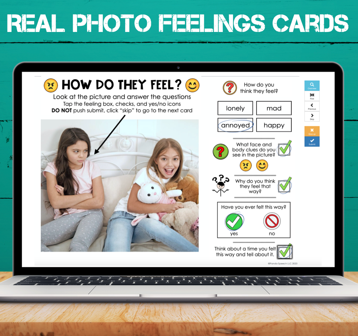 • Identifying the feeling: They are four choices with multiple correct answers depending on the student’s perspective, if the student responds with a choice not listed, that is okay too.