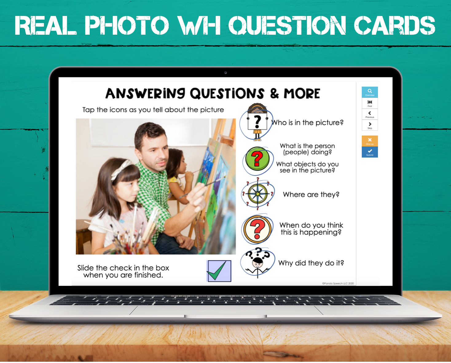Use the WH Questions teaching card with visual cues about each question type.