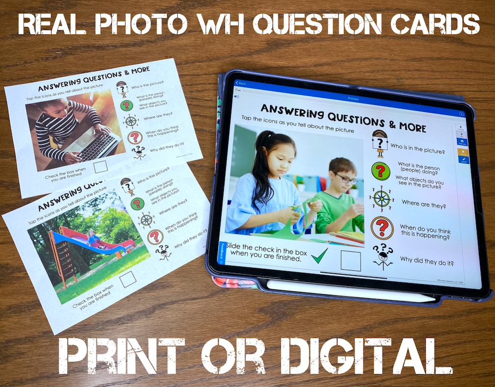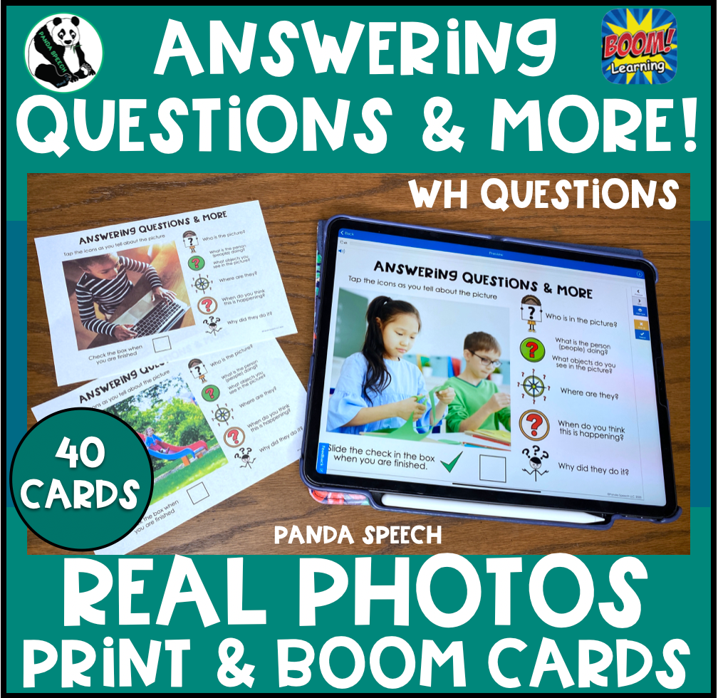 - Answering WH questions- Some of my students have difficulty discriminating between the question types so I use these cards as a way to work on it in a structured way (there could be multiple right answers but I am looking for the correct response to the specific question form (who, what, where, when, why?).