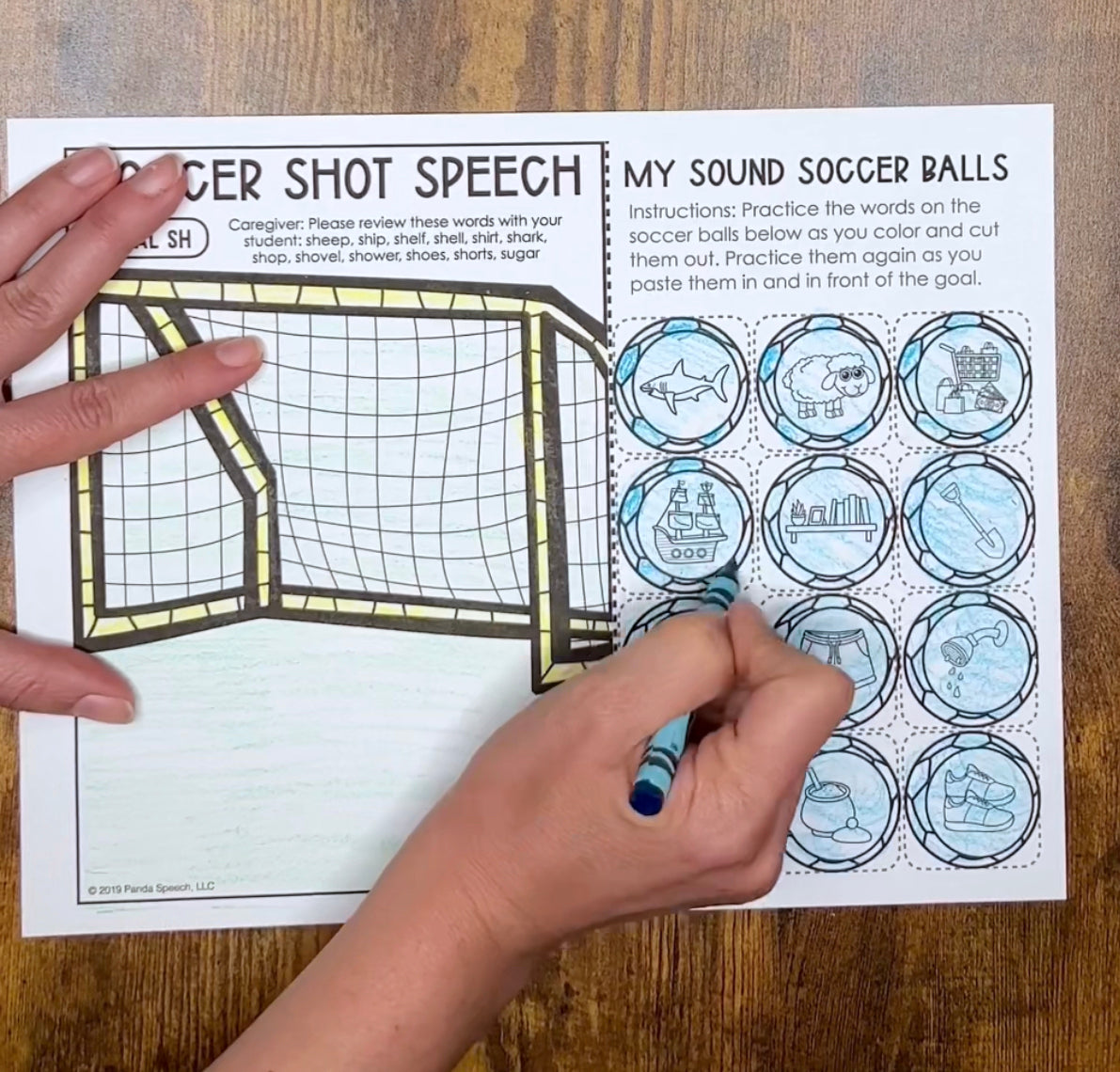 How to use: Articulation pages: The student will color and practice each target word on the soccer balls. The student will cut out the balls and practice the words again. The student will glue each ball in and in front of the goal and practice the word one more time! If you are working in groups, have the other students color their soccer goal in between turns. Language pages: The student will practice the skill as they color, cut out, and glue the basketballs in, on, or around the hoop. The therapist will determine the number or trials for the articulation page.