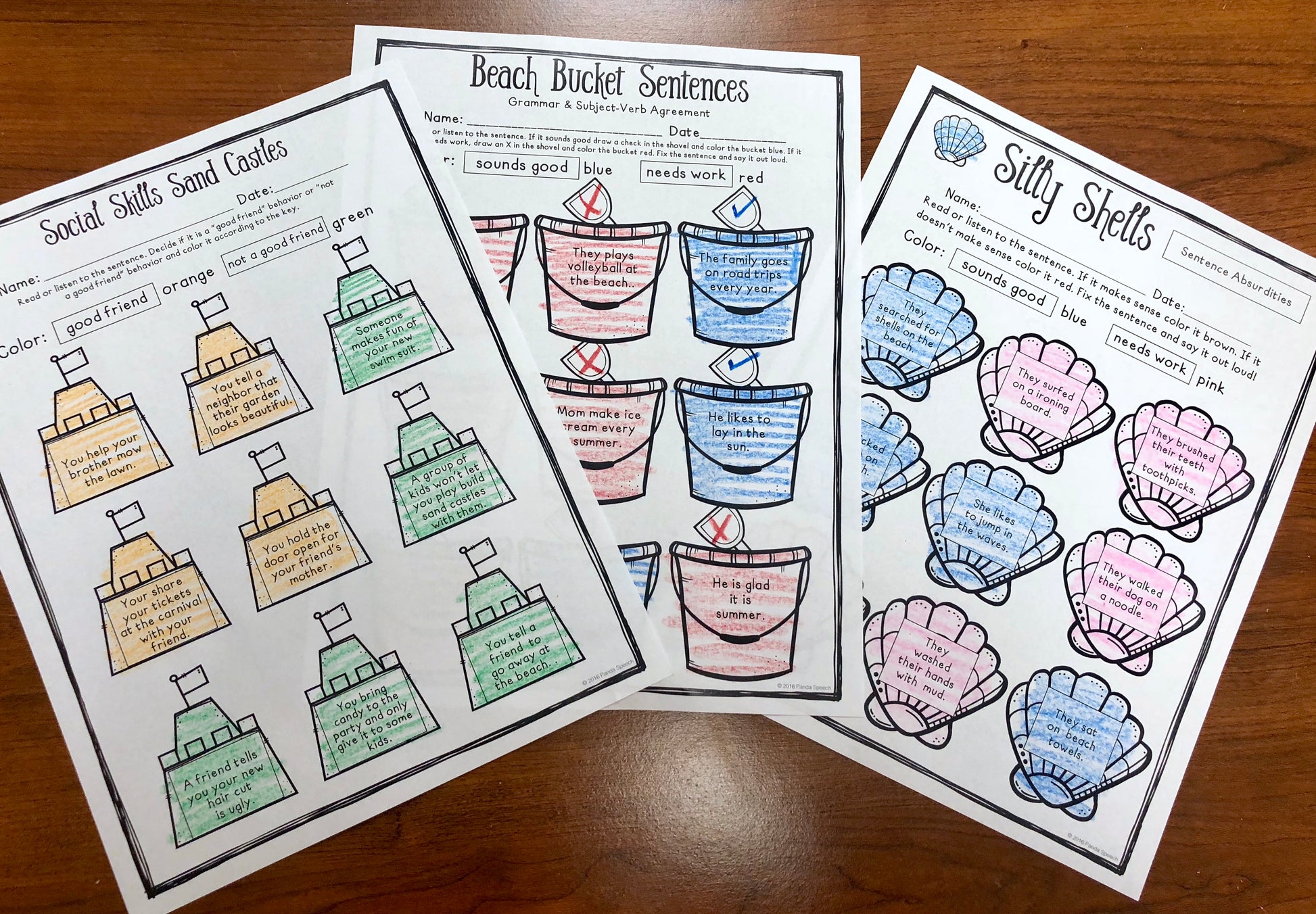 Sunshine Categories (find objects in categories), Which One Doesn’t Belong, Summer Categories (name 3 items in a category), Compare and Contrast, Surfs Up Associations, Beach Crab Positions (positional vocabulary), Feelings Sort, -ing Verbs, Past tense (regular-27, irregular 28), Plurals (regular 29, irregular 30), Summer Stories (story comprehension), Social Skills Sand Castles, Jelly Fish & Seaweed Antonym Sort, Color by Synonyms, Beach Bucket Sentences (subject-verb agreement), Silly Sentences (sentence absurdities), Summer Listen Up! (following directions), Color by Multiple Meaning Words, Seashell Word Work (vocabulary exercise), Seashell Story Retell, Summer Bingo (summer vocabulary), BONUS Open Ended Dice Coloring Sheet, Full Color Bingo Boards!
