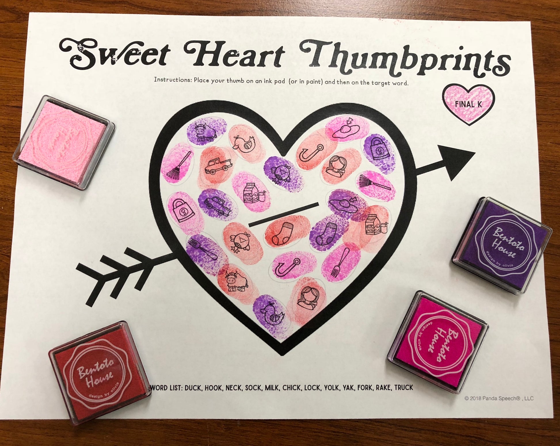 Materials Needed: Ink pad or paint (red or pink recommended), thumbprint pages, wet wipes (tip: keep wet wipes handy to wipe thumbs between turns).