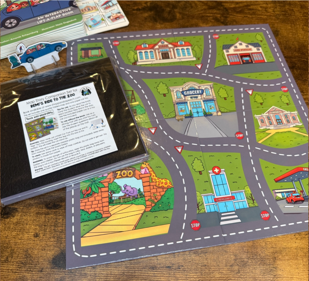 Please note: The map and paper toy car need to be used with care. Panda Speech LLC is not responsible for replacing damaged pieces due to normal wear and tear/play. Young children should be supervised when using these sets due to the small pieces (choking hazard) and interactive nature. By purchasing this book you agree and understand this statement.
