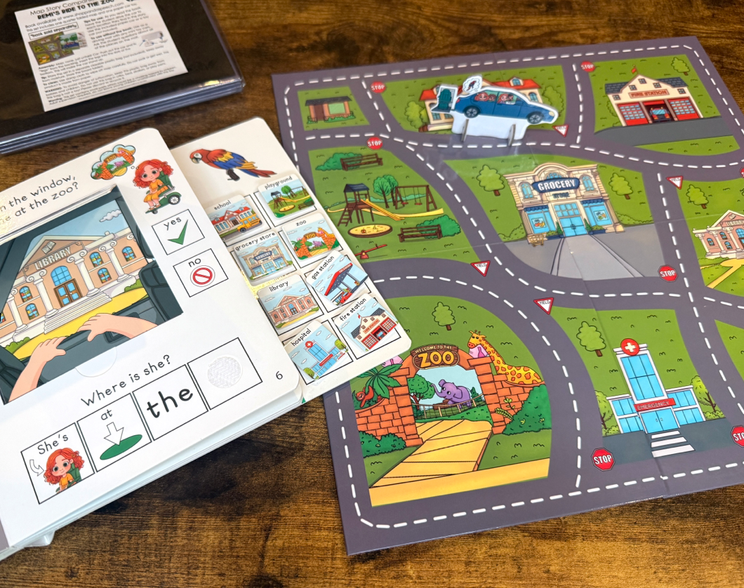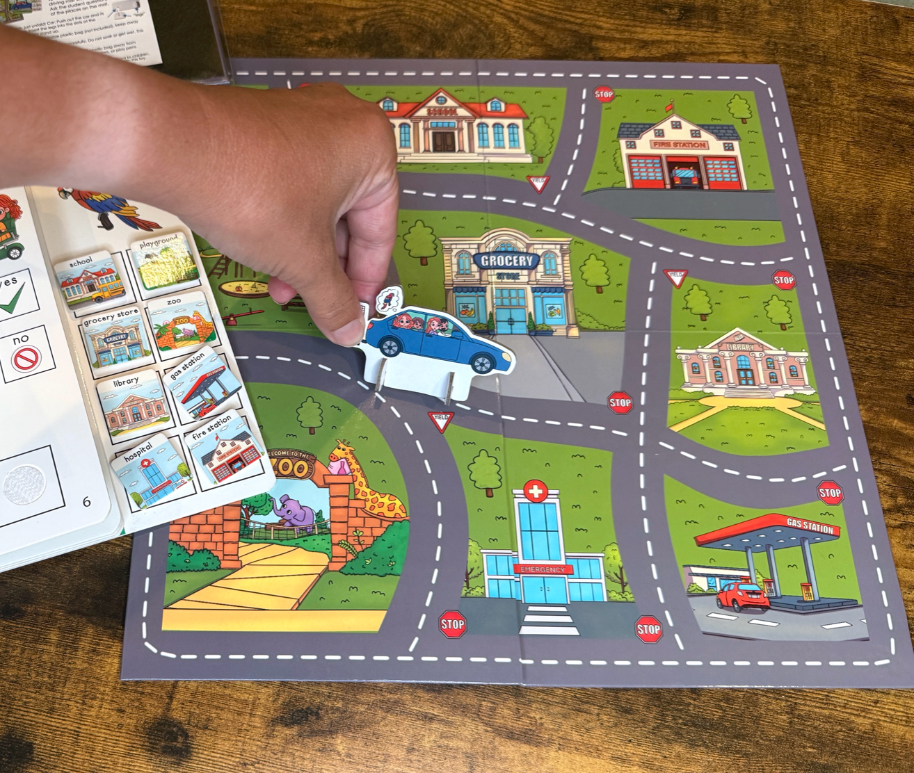 To use without the book: Use as a  driving mat with any mini toy cars. Ask the student questions about all of the places on the mat.