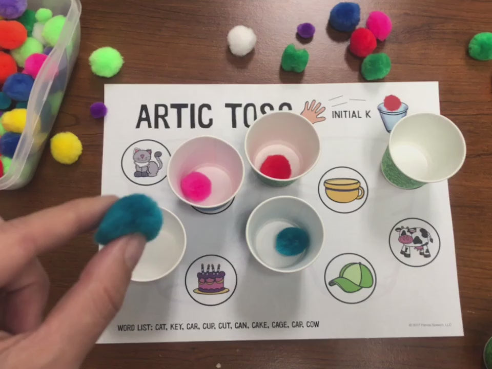 To use: Set the desired Vocab Toss Mat across from the student and give them 10 pom poms. I do this activity on the floor to allow more tossing space. Line up the cups over the circles on the mat.  I do this game in rounds, but you could also do it one at a time (toss and then practice). The student will toss ten pom poms at the mat and try to land them in the cups.  At the end of the round, the student will practice the language skill under the cups that the pom poms landed in. For the next round, take those cups off of the mat and toss again. Continue until all of the cups are gone and all of the circles have been practiced. I suggest doing a couple practice tosses to gauge the distance needed for the mat.